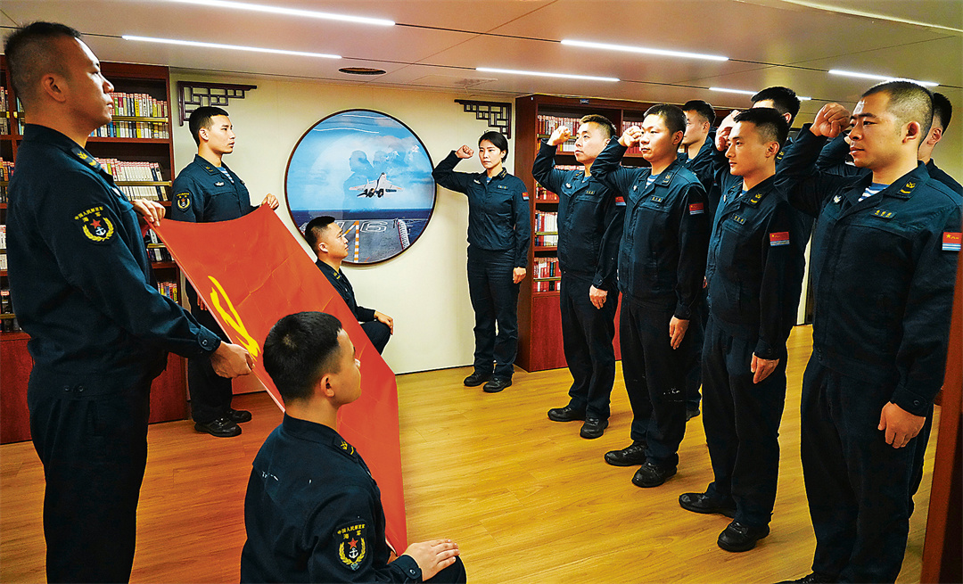 11月25日,海军辽宁舰上,几名年轻党员举起右拳,面向党旗庄严宣誓。
