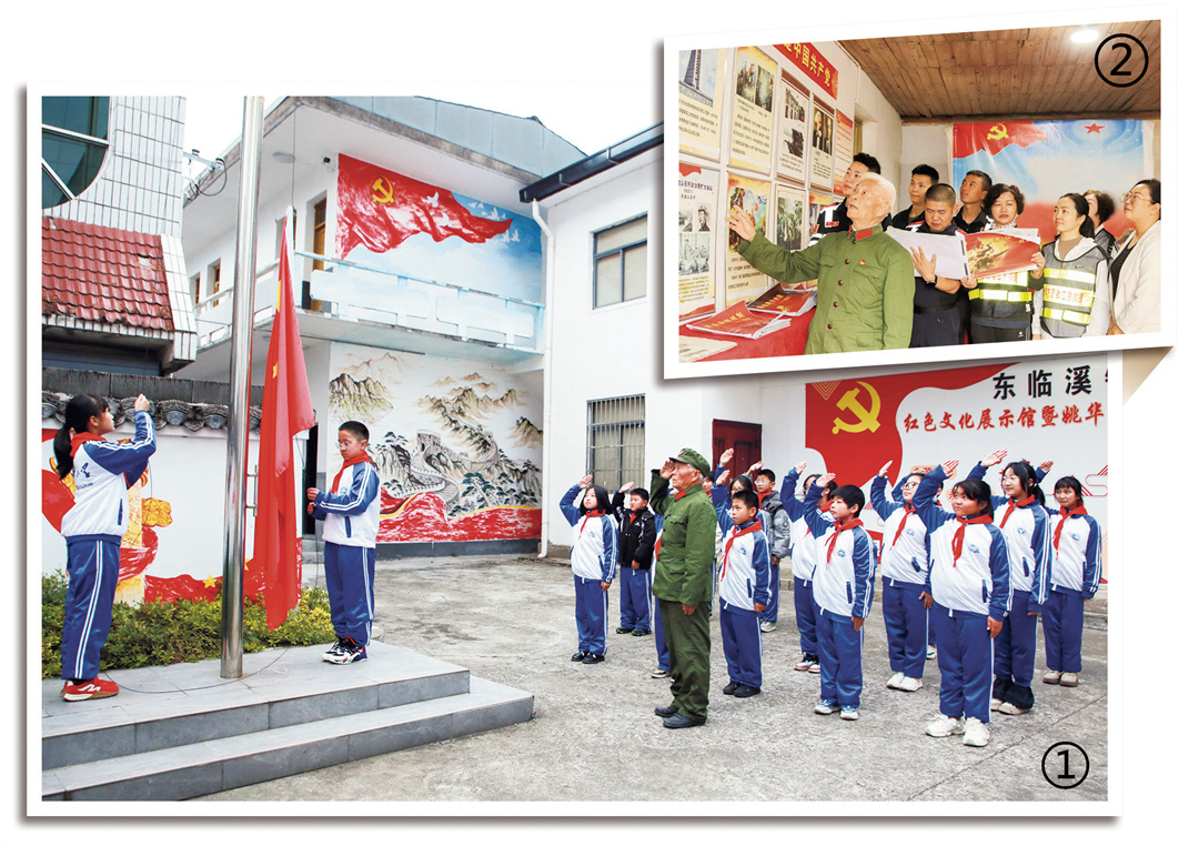 图①:11月24日,姚华亮应邀为安徽省休宁县汊口中心小学学生上国防教育课,并与学生一起到东临溪镇红色文化展示馆参加升旗仪式。武时化 摄