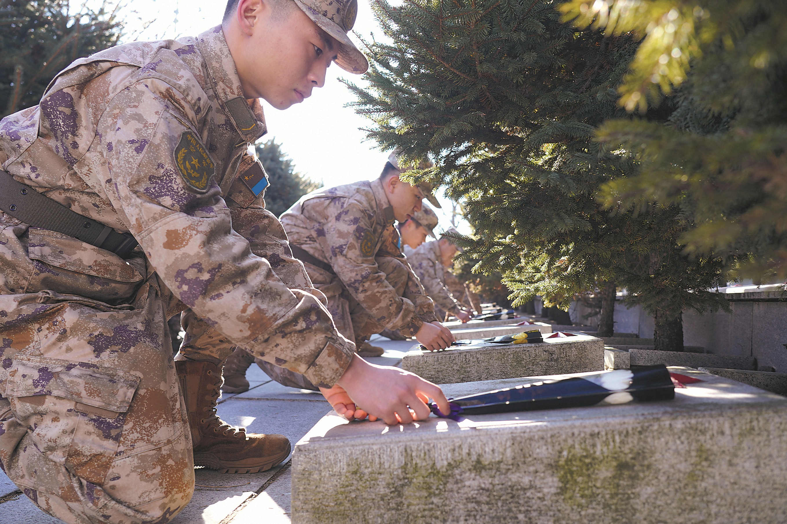 新兵户嘉琦在烈士王靖声墓前屈膝蹲下,轻轻拂去碑上积雪,仔细擦拭烈士英名。1952年5月25日,23岁的某团二大队大队长王靖声在战斗中为掩护战友,向敌双机攻击,壮烈牺牲。户嘉琦对记者说:“我来自狼牙山五壮士跳崖所在地,入伍前我特意又去了一次五壮士跳崖处。只要祖国需要,我会像五壮士和王靖声烈士一样,毫不犹豫地献出生命。”