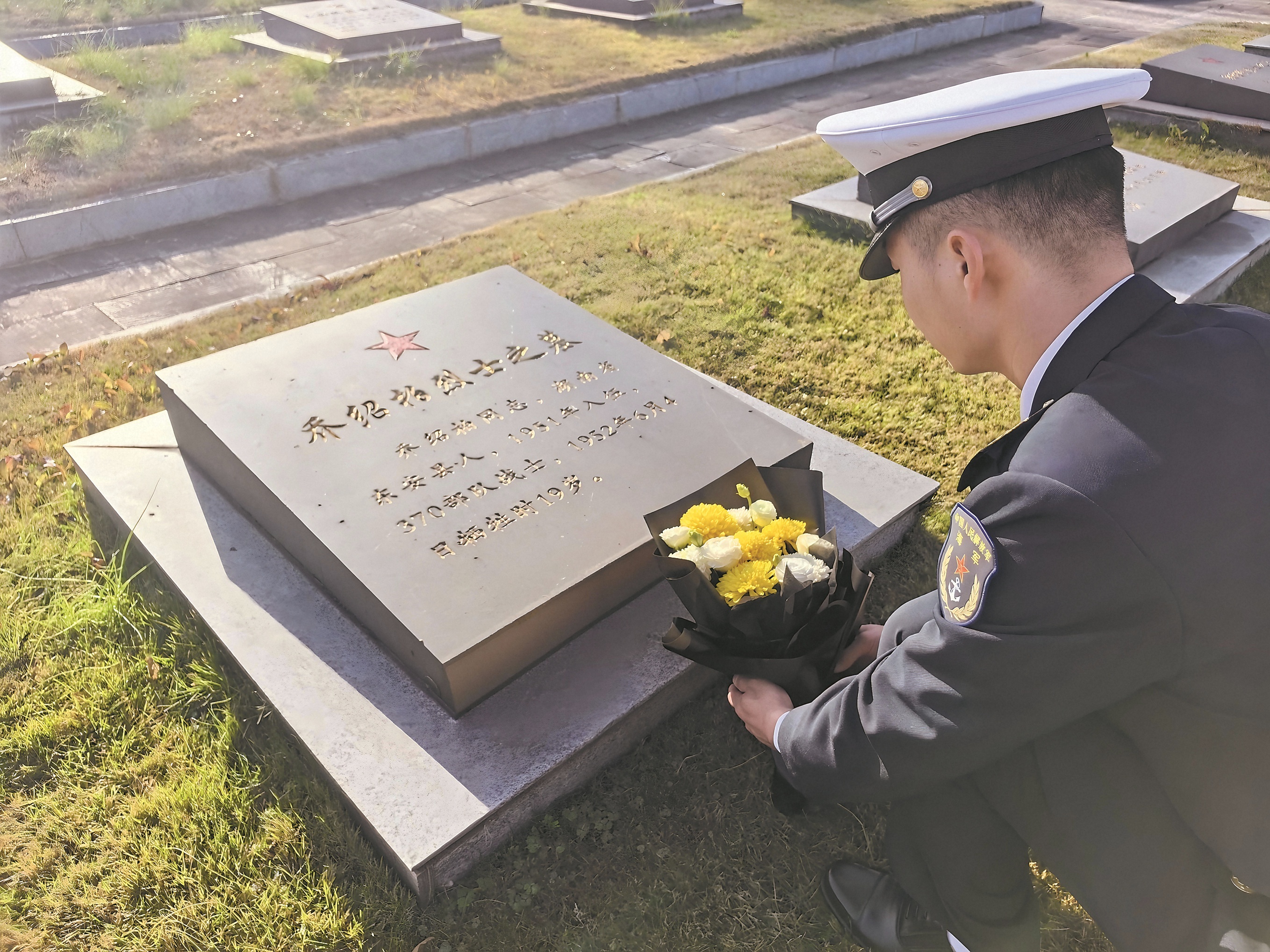 冬日,湖北省赤壁市羊楼洞抗美援朝烈士陵园,松柏挺立,微风轻拂。海军某部“团结巩固模范连”二级上士张斌俯下身,用白毛巾轻拭一方墓碑,碑面上7个大字十分清晰——“乔绍柏烈士之墓”。“老班长,我们来看您了。”话语轻柔,饱含后辈对先烈的无尽追思。
