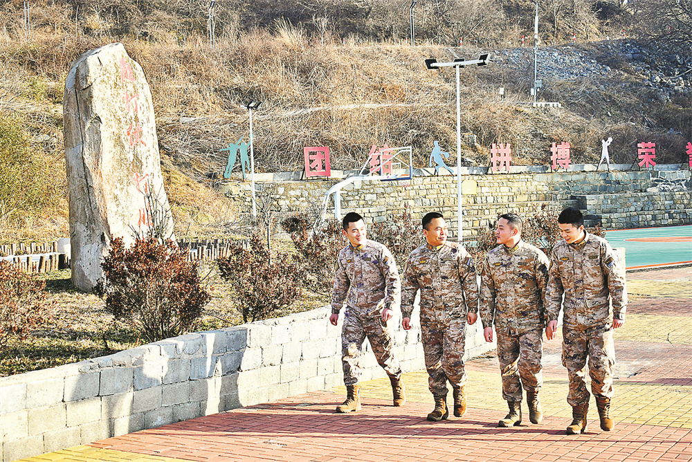 刘佳乐咬咬牙,收紧背带。山路覆雪,走上去“咯吱”作响。行至陡坡,他被背囊压得气喘吁吁,雪粒模糊了视线。忽然他感到肩头一轻——回头一看,温班长正用手帮他托着背囊。