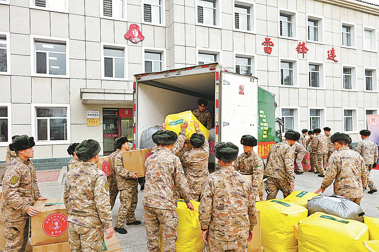 “雷锋连”官兵将助学物资装上邮车。李东雪 摄