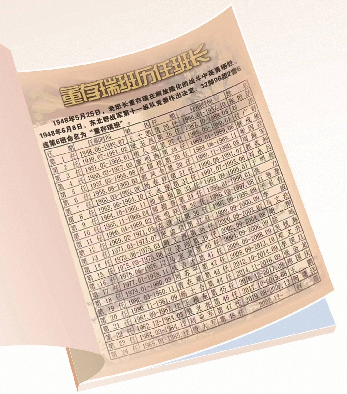 功夫不负有心人。2023年初春,吕景成终于把1948年“董存瑞班”命名以来的历任班长的信息全部找到,遗憾的是,已有12任班长离世。