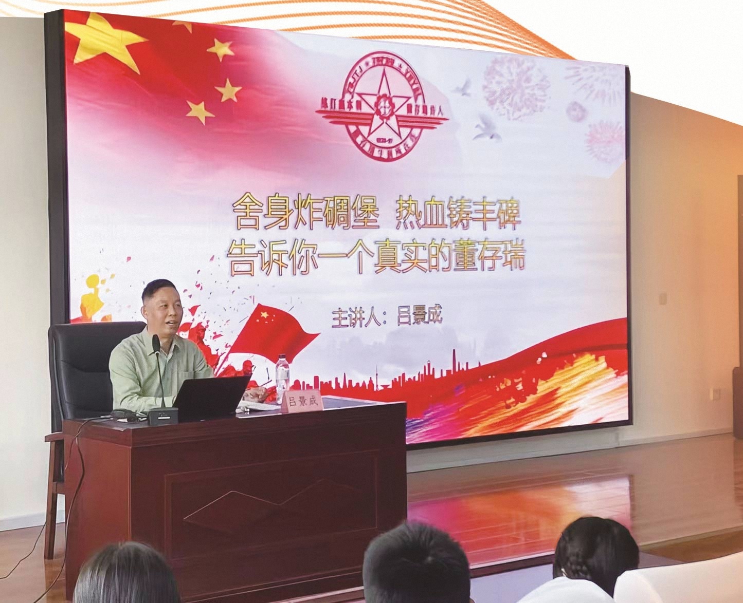 吕景成走上学校讲台讲述董存瑞战斗故事。