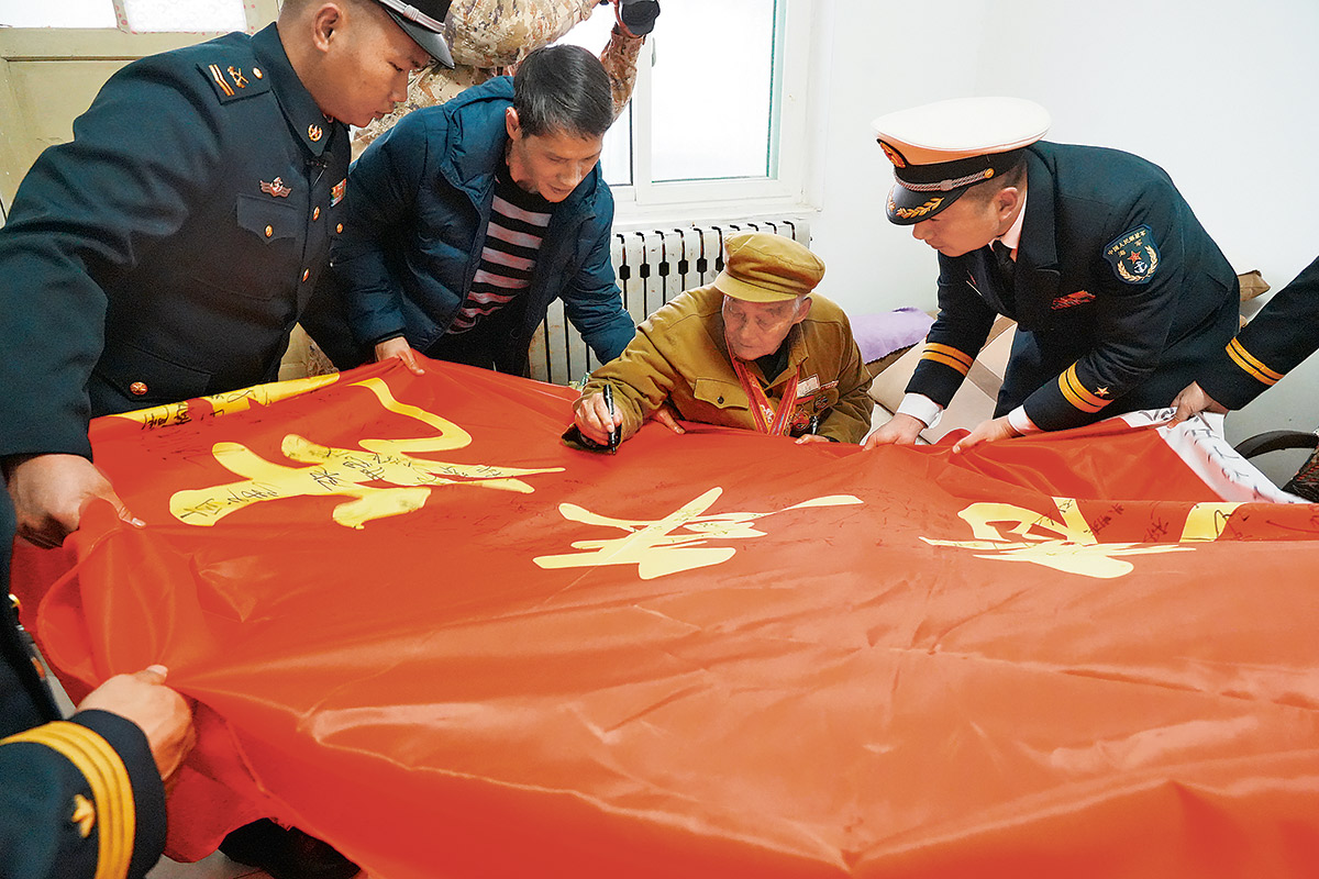 房来廷在荣誉战旗上签名。韩 亮摄
