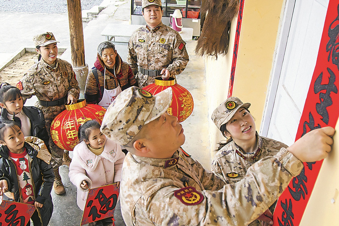 两个民兵连民兵为乡亲们贴春联送祝福。谭华 摄