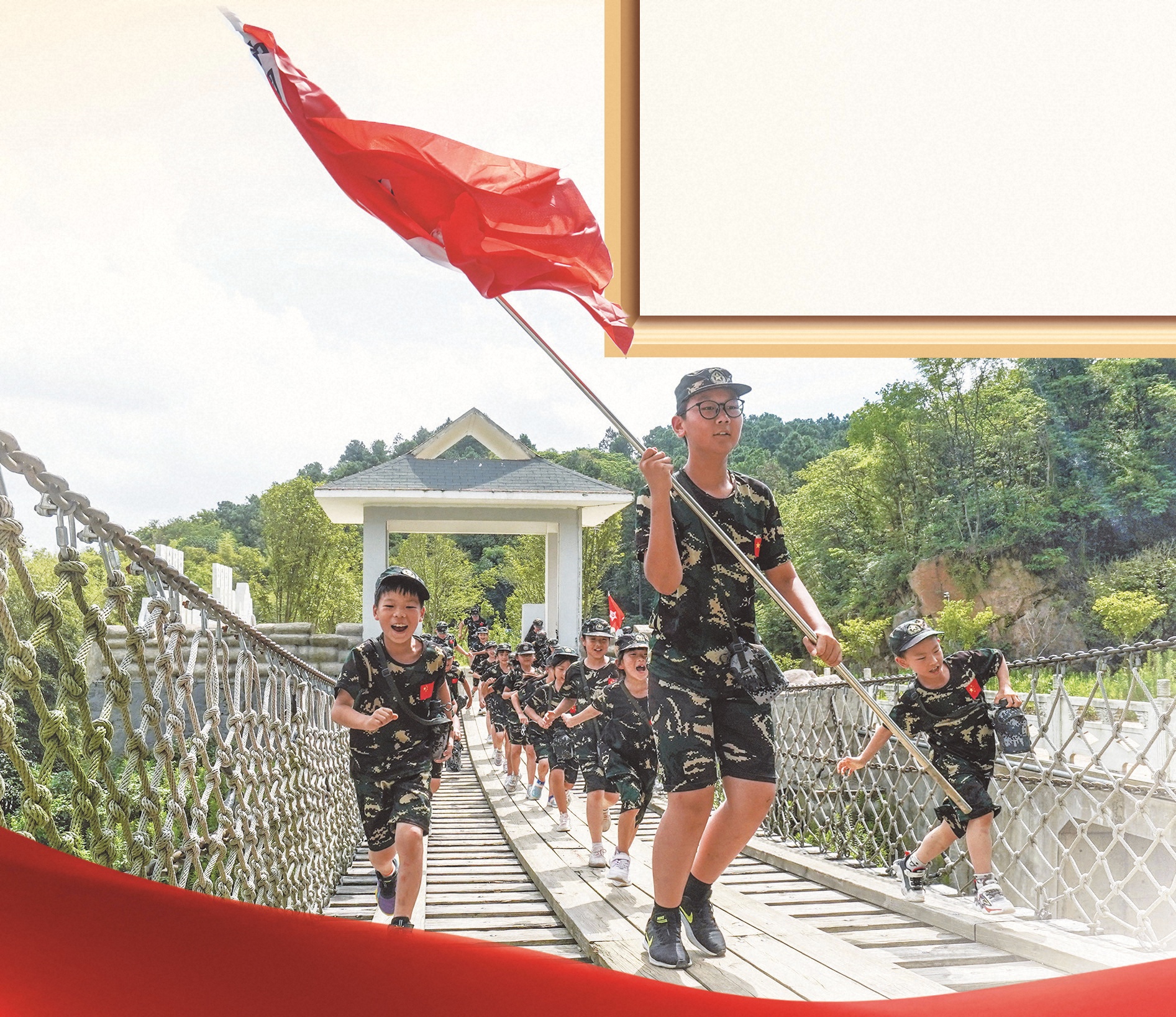 江苏省南京市参加军事夏令营的学生在“缩微版长征”中列队通过悬索桥。杨磊 摄