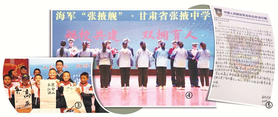 图③:海军昆仑山舰官兵与青海省格尔木市学生共写毛笔字。郑凯凯摄 图④:海军张掖舰官兵代表走进甘肃省张掖中学开展共建活动。高源鸿摄 图⑤:海军巴彦淖尔舰官兵给内蒙古巴彦淖尔市学生的回信。解放军报特约记者 蔡盛秋摄