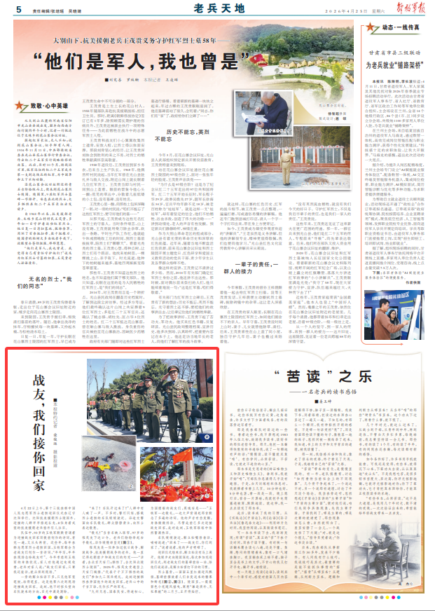 队伍中,93岁的王铁军默默背诵着为迎接战友回家而提前创作的诗词,背完一遍,又从头再背。近些年,每年在韩志愿军烈士遗骸回国,王铁军都会为老战友们创作一首诗词,“年年写,年年在现场念给战友听”。今年考虑到王铁军的身体状况,家人劝他通过电视收看,老兵对家人说:“战友们回家,只要我还能动,就必须到现场。”