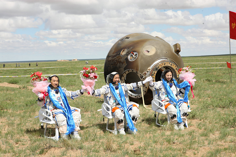 2013年06月26日,聂海胜、张晓光、王亚平在四子王旗着陆场返回出舱。 徐部 摄