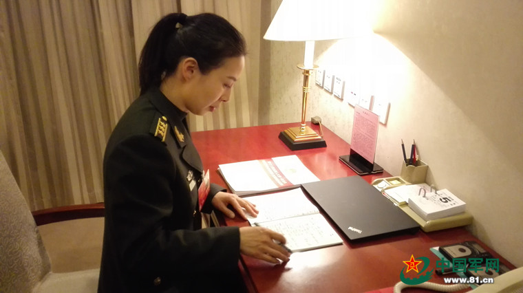 台灯下,王亚平代表正在伏案准备发言材料。中国军网记者 洪文军摄
