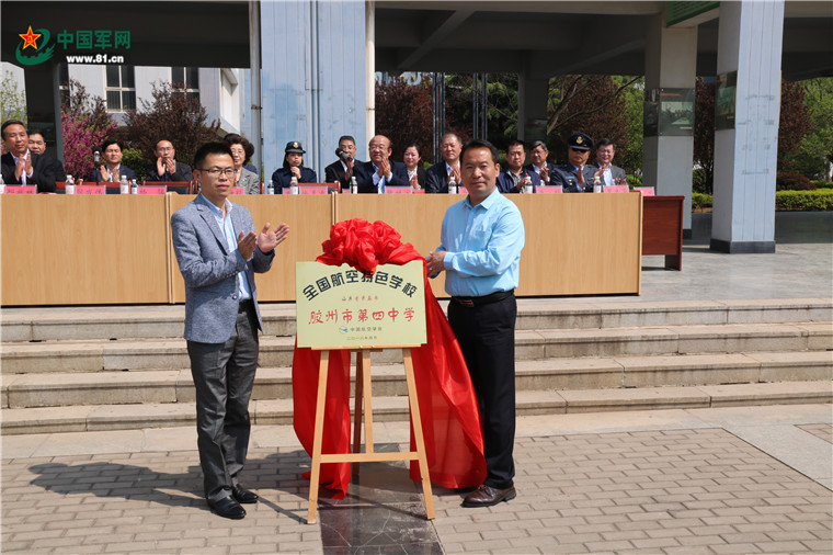 “全国航空特色学校”揭牌仪式4月25日上午在青岛市胶州四中礼仪广场隆重举行, 胶州市第四中学成为青岛市首个经中国航空学会批复的“全国航空特色学校”。中国空军功勋试飞员、国家科技进步特等奖获得者徐勇凌出席仪式并作了题为《翱翔者之歌》的精彩报告。