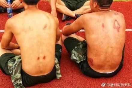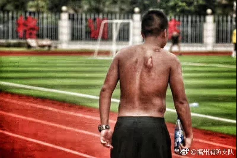 这是一位1997年出生的消防兵,他叫沈伍呷,因体能训练背部受了伤。