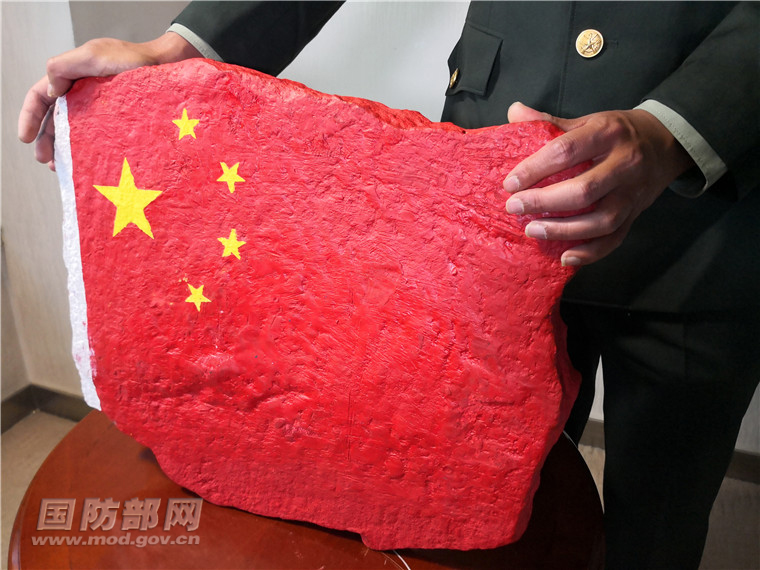 范小军在巡逻路最高点位找到这块“飘扬”的石头,并亲自画上了国旗,而后又背着这面石头 “国旗”在高原行走3公里。写在国旗旁边的“5418”字样,标注的是他和战友们反复走过的巡逻路的海拔高度。范小军将这块国旗石背到北京,只为向祖国报告,喀喇昆仑卫士的赤胆忠心。