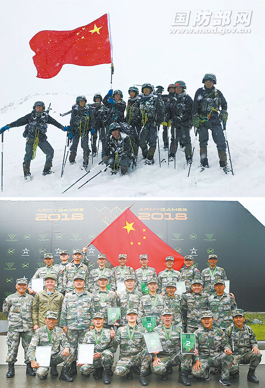 上图:队员们完成登顶后返回途中在厄尔布鲁士山上与国旗合影。下图:今年的比赛中,中国参赛队取得了3个单项第一、总成绩第二的好成绩。段斐 摄