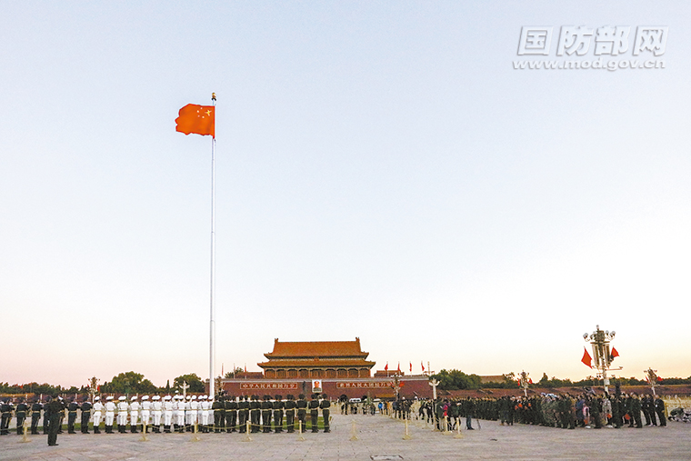 在国歌雄壮的旋律烘托下,鲜艳的五星红旗徐徐攀升。映衬着东方第一缕曙光,那一抹红越升越高,跃动在秋日的碧空中。