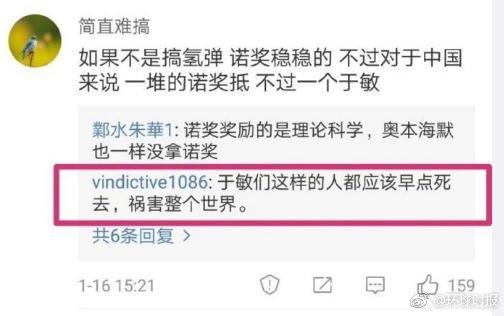 1月16日,微博网民“vindictive1086”在微博跟帖辱骂已故科学家于敏,造成严重影响。