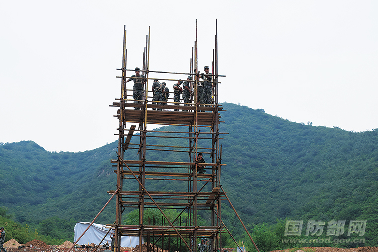 陆军某工程维护团一营二连官兵搭建烈士纪念碑的施工脚手架。