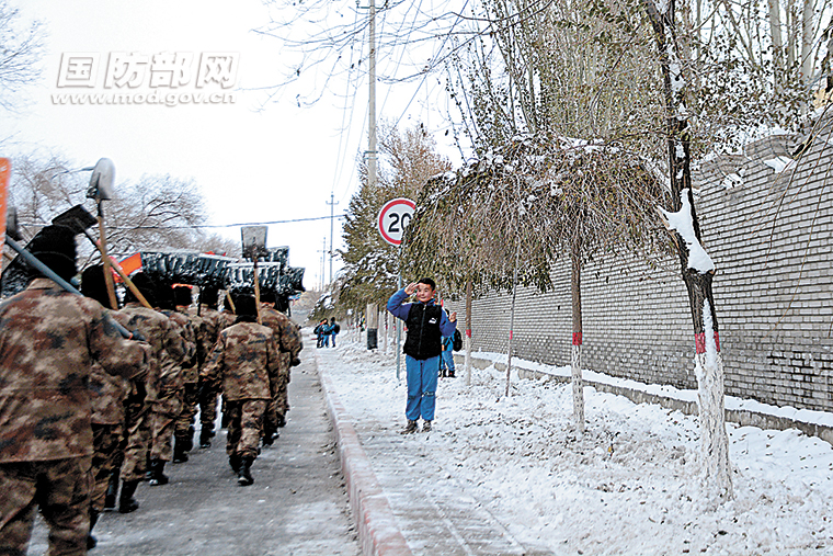近日,强冷空气来袭,多地普降大雪。西部战区陆军某边防团紧急出动官兵清理驻地附近交通干道上的积雪和残冰。官兵完成任务回营途中,一名小男孩面向行进的队伍敬了一个军礼,并大声喊道:“解放军叔叔,你们辛苦啦!”郎雪峰摄