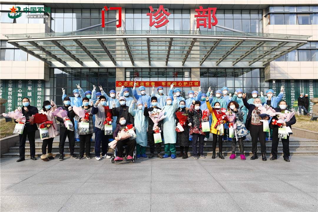 2月21日,中部战区总医院又一批治愈患者康复出院,图为康复者和医护人员合影庆祝。