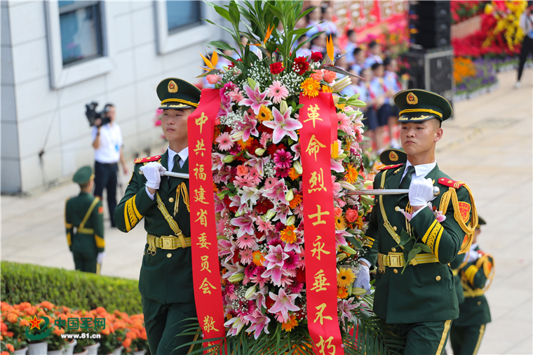 默哀毕,少先队员献唱《我们是共产主义接班人》,并高举右手、齐致队礼。随着“礼兵就位”的一声口令,驻榕部队担负礼兵任务的武警官兵步履端庄、力着千钧,礼兵靴敲击地面发出的“笃笃”声在安静的陵园回响,牵动着追悼者的内心。伴随深情的《献花曲》,18名英姿飒爽的礼兵托起花篮,迈着庄重的礼步缓缓走向烈士纪念碑,将花篮稳稳摆放在纪念碑基座上。参加仪式的全体人员怀着崇敬的心情向纪念碑致注目礼向英烈致以崇高敬意。