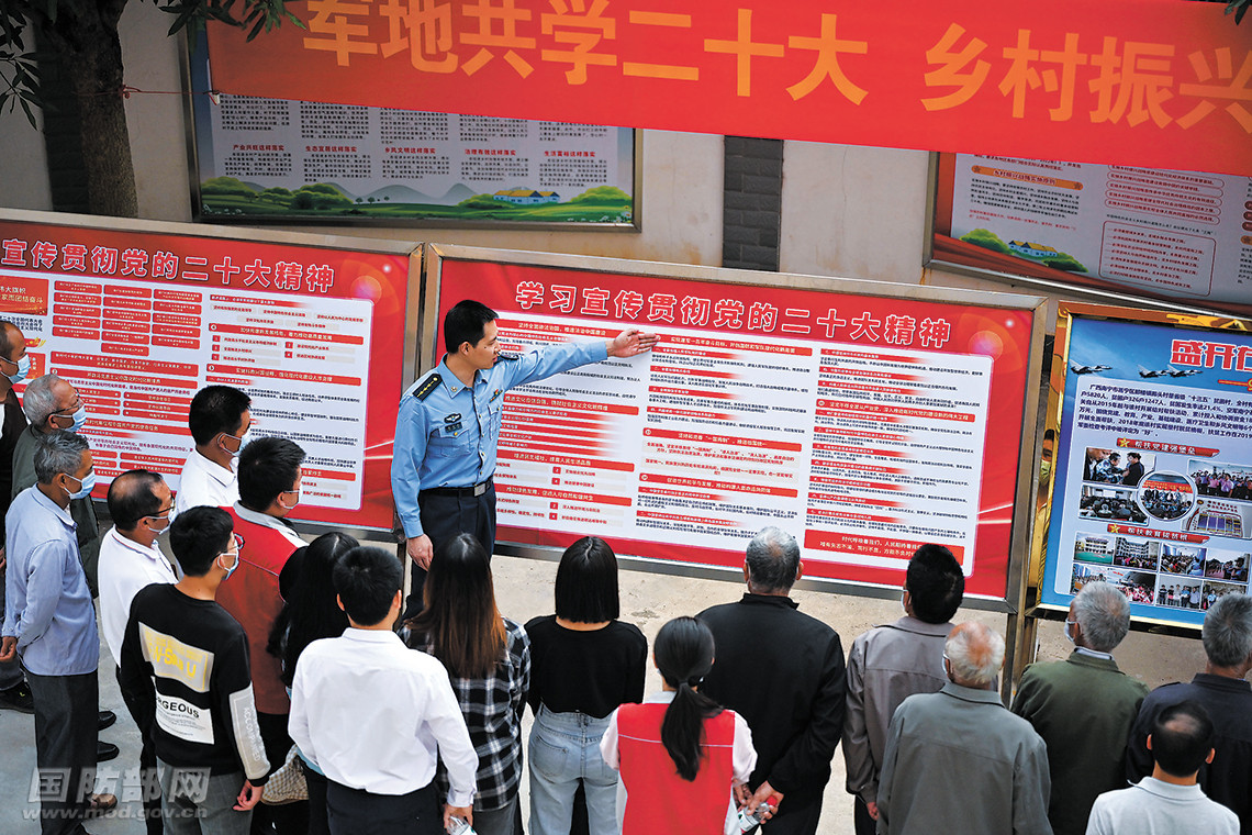 11月4日,南部战区空军某基地来到对口帮扶村广西南宁市邕宁区那头村组织开展“军地共学二十大,乡村振兴谱新篇”专题党日活动。他们邀请党的二十大代表、该部“钢铁雷达连”指导员聂灵杰走进帮扶村,为村两委、党员宣讲党的二十大精神。活动中,他们到稳定脱贫户家中回访,帮助其理清未来发展思路;走进种植园,与村干部共同研究部队援建的百香果种植基地种植规模和产销发展前景。