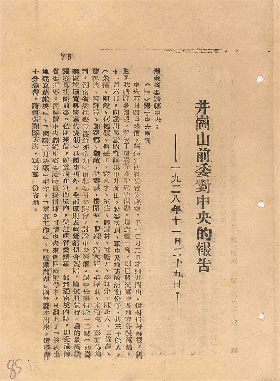 图为《井冈山前委对中央的报告》首页,该报告收录在1945年中共山东分局印发的《党的路线问题选集》。 解放军档案馆提供