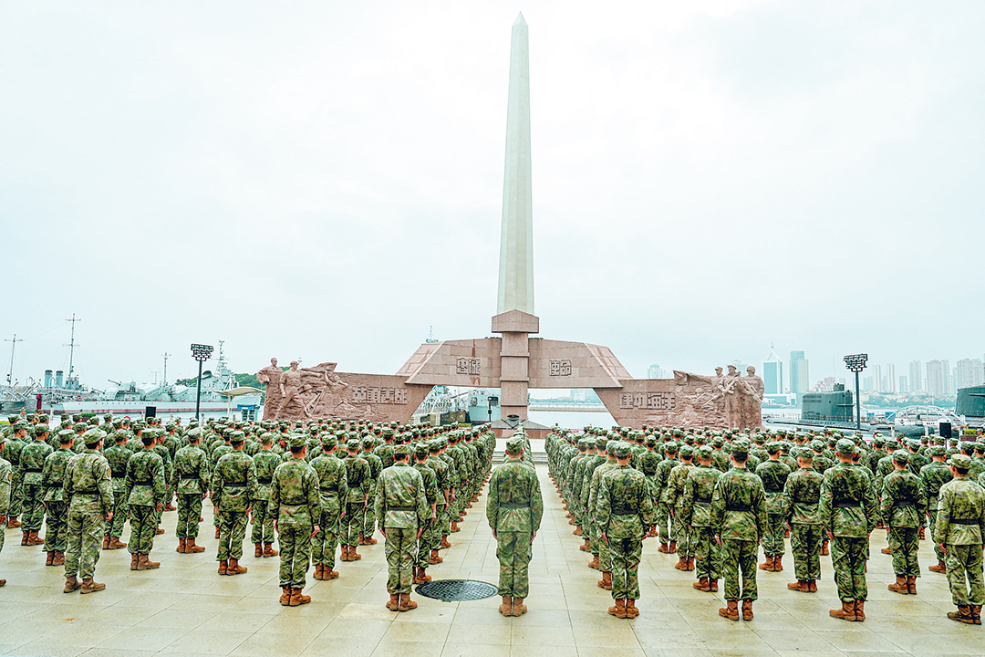 “我是中国人民解放军军人,我宣誓……”领誓人的声音铿锵有力。誓言声声,字字千钧,在英雄广场上空激荡,与不远处海浪的澎湃声交织在一起。