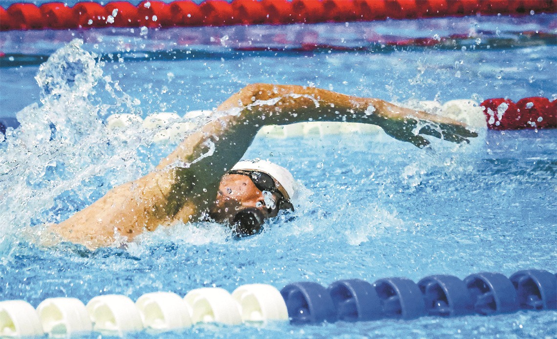 游泳馆内,喝彩声一浪高过一浪。大三学员邓哲元身姿矫健、劈波斩浪。刚和队友一起夺得男子4×100米蛙泳接力冠军的他,休息片刻后又参加男子50米蛙泳比赛。蹬腿发力、稳定节奏、全力冲刺……碧波翻腾的泳道上,邓哲元以34秒03的成绩夺冠,并且刷新了该项目的校运会纪录。在本届军体运动会上,他还摘得男子50米自由泳金牌。