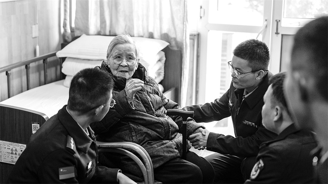 阳光房内,国防大学政治学院某学员队的学员们,手捧精心订制的生日蛋糕,为面前20多位白发苍苍的老人唱起生日歌。92岁高龄的罗学文老人紧紧握住学员马绪豪的手,眼眶湿润:“这是我第8次和‘兵儿女’一起过生日。”