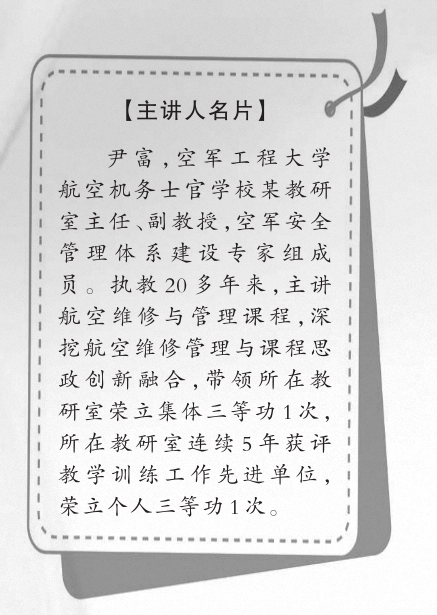 如今,学校立足机务院校实际,将实战化要求融入课堂教学、实训演练,让每一名学员明白:机务工作没有“差不多”,只有“零差错”;没有“旁观者”,只有“守护者”。尹富教员的课堂,教技术也传精神,让机务兵的精神通过一代代学员传承下去。而他牵头的教研团队,贴合一线需求聚力攻坚,彰显了机务院校教员队伍的责任与担当。