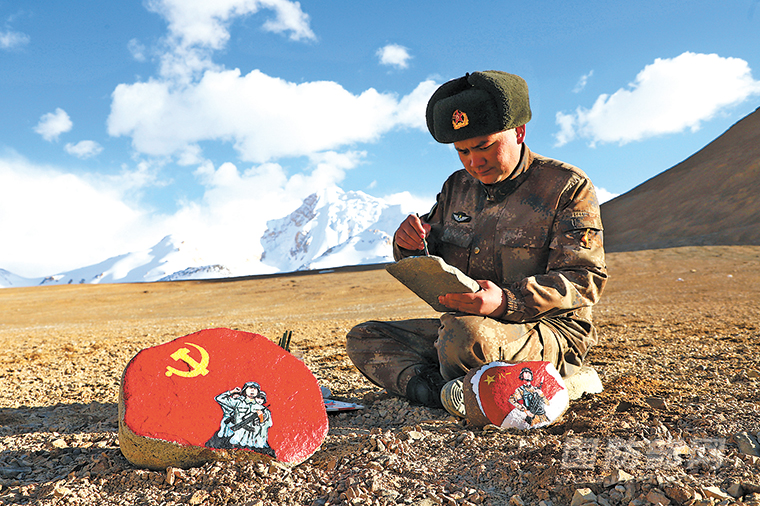 帕肉克·吾马尔从小喜爱绘画,入伍后一直坚持用画笔记录和描绘自己与战友的训练生活。在雪域高原驻训虽然艰苦,却没有消磨他的创作热情。无论是大自然瞬息变换的景观,还是战友们在训练场上的拼搏姿态,抑或是驻训期间的酸甜苦乐,在他眼中都是生动的素材。大大小小的石头,就是他的画布。看到自己的作品得到战友们认可,帕肉克·吾马尔开心极了。