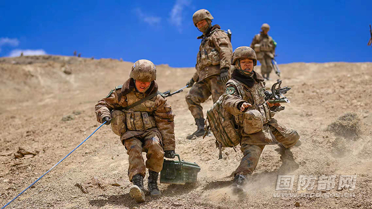 训练中,新疆军区某团官兵快速沿陡坡下山。