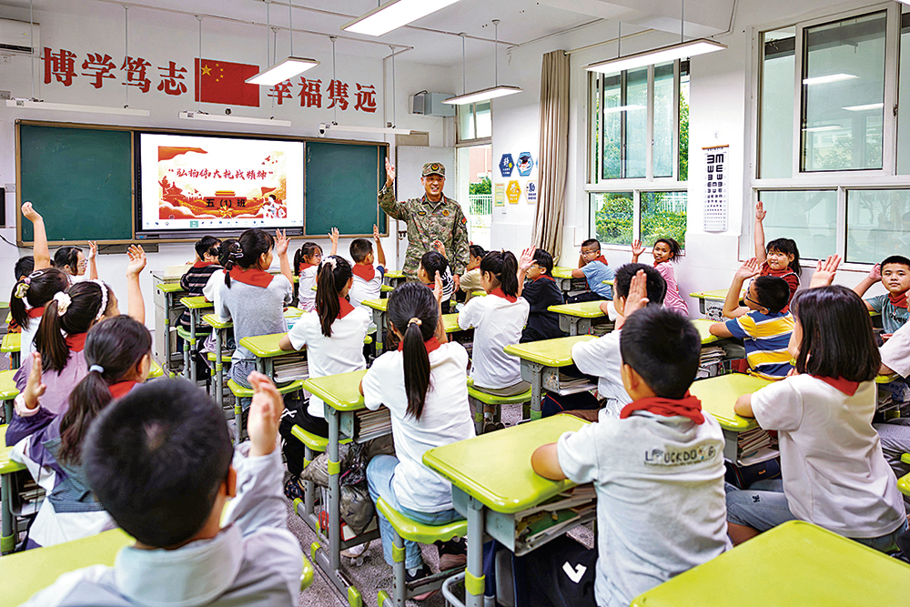 9月中旬,江苏省盐城市大丰区人武部开展国防教育进校园活动。图为该区民兵讲述抗战故事时与学生互动。纪毅丰摄