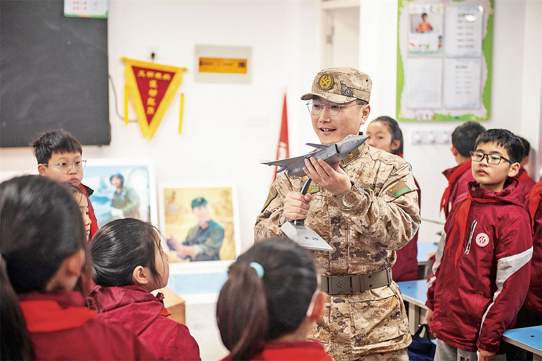 三月下旬,安徽省淮北市相山区人武部组织工作人员走进当地学校,通过开展讲述红色故事、介绍武器装备、制作国防主题手工作品等活动,提升学生国防意识、增强国防观念。张伟 摄
