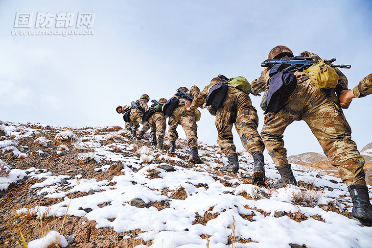 新年伊始,驻守在海拔2900多米的“西陲第一哨”、新疆克孜勒苏军分区斯姆哈纳边防连巡逻分队再次踏上巡逻路。图为官兵在雪山上艰难爬行。杜麒麟 摄