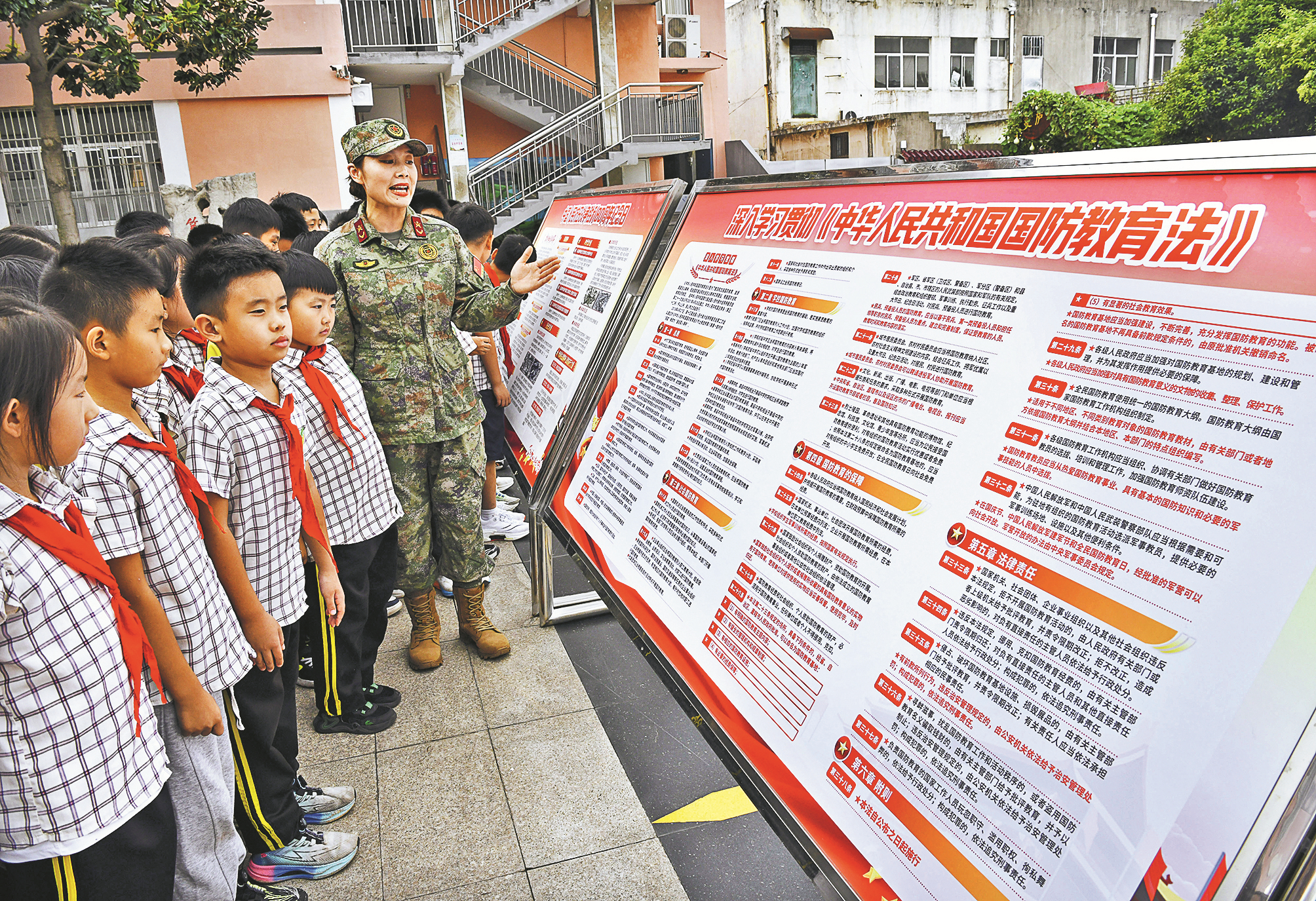 近日,山东省枣庄市山亭区“王家湾铁姑娘民兵连”民兵走进该区第一实验小学开展国防教育。曹耕萌 摄