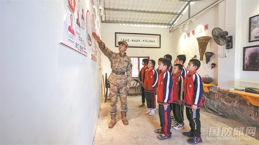 驻军某部官兵为少先队员讲述红色历史,开展爱国主义教育。