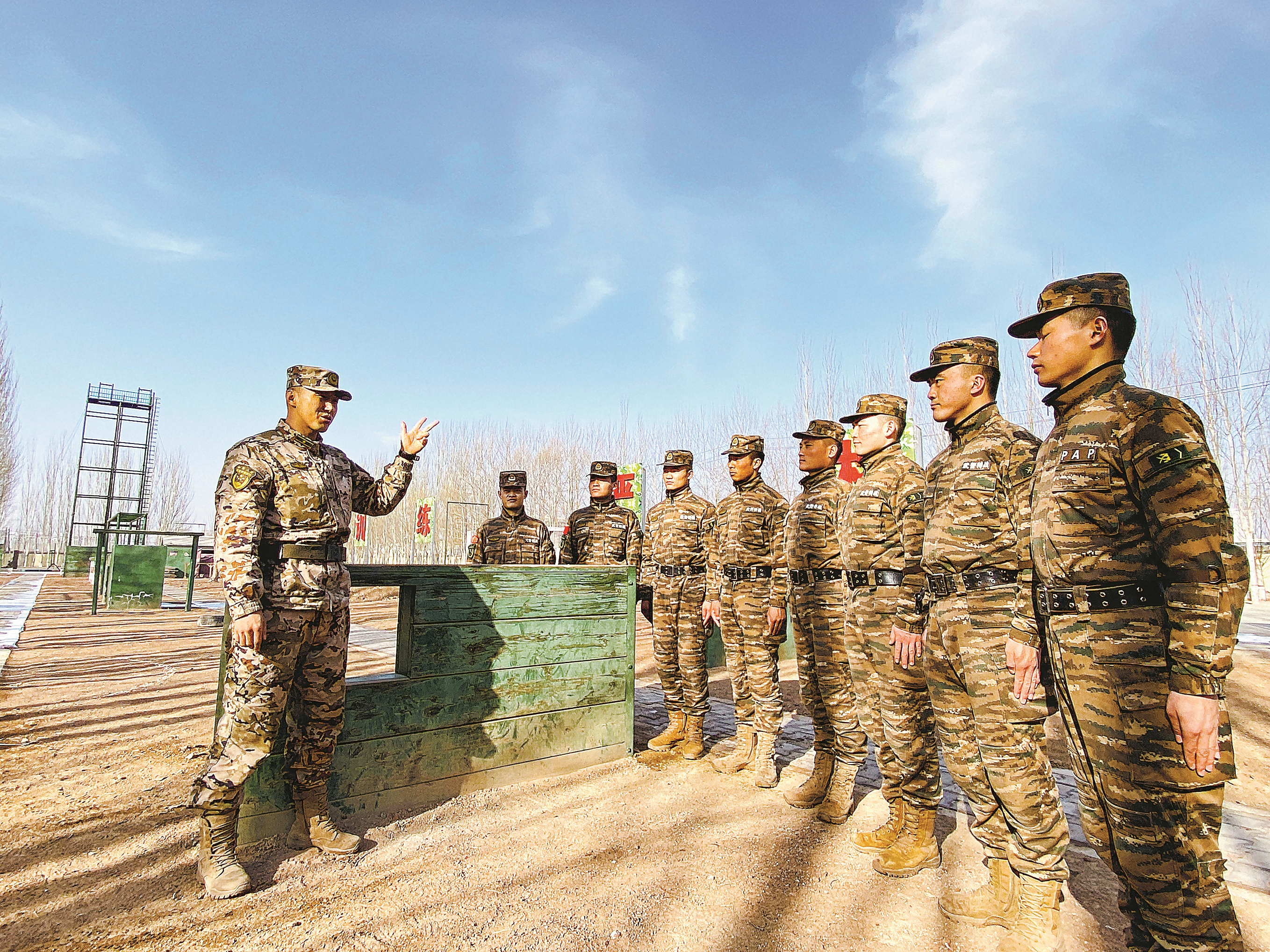布和图木尔(左一)为战友讲解训练动作要领。张宇枢 摄