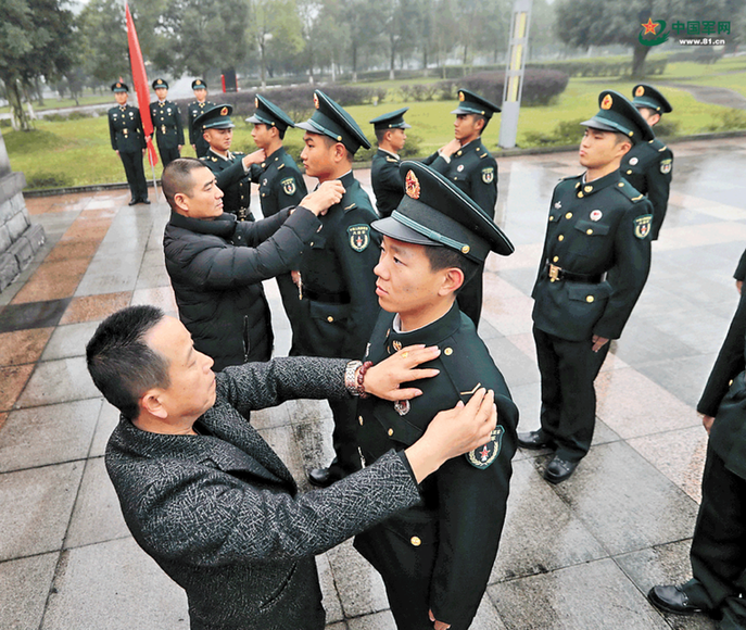 今年1月,老兵朱鹏(左前)、史安康应邀参加火箭军某旅新兵授衔仪式,亲手为他们的儿子佩戴列兵军衔。