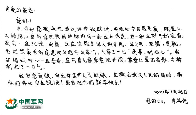 他们的女儿宋美伦,在父母执行任务时,住在姥姥家。由于爸爸平时比较繁忙,她与爸爸的交流并不太多。这段时间,她默默地每天都从网络上查看武昌医院的救治动态,盼望着能找到爸爸的身影。她还跟妈妈要了一张爸爸穿防护服的照片,自豪地分享给同学们,把爸爸称作英雄。大年初四,妈妈在电话里告诉她,爸爸很忙,但一切都好。她想打电话不便,就提笔给爸爸手写了一封信,拍了照,用微信发过去。信虽不长,却在字里行间诉说着对爸爸的想念和敬佩,流淌着女儿的自豪和支持!