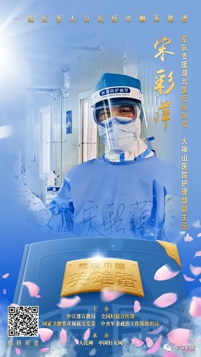 3月7日,军队支援湖北医疗队队员、火神山医院护理部副主任宋彩萍荣登“一线医务人员抗疫巾帼英雄谱”。