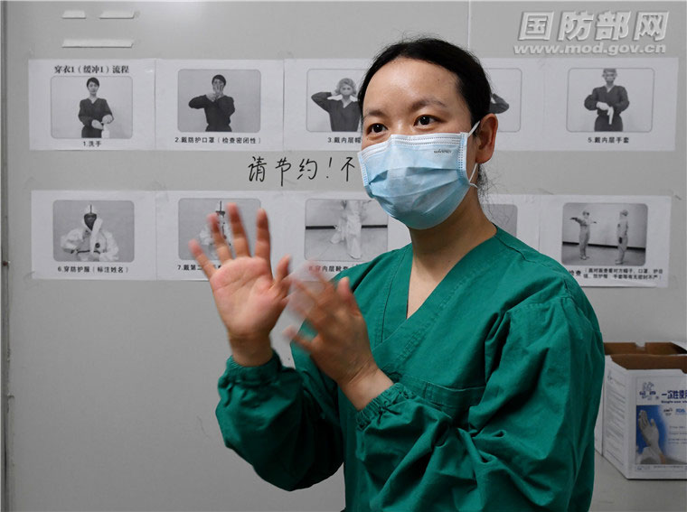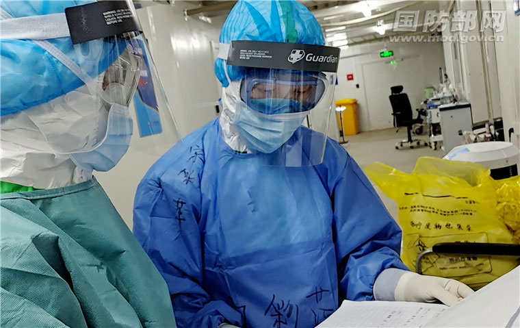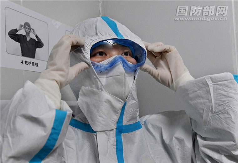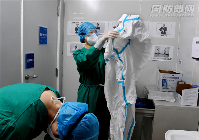 进入病房前,宋彩萍认真帮助战友检查防护装具。