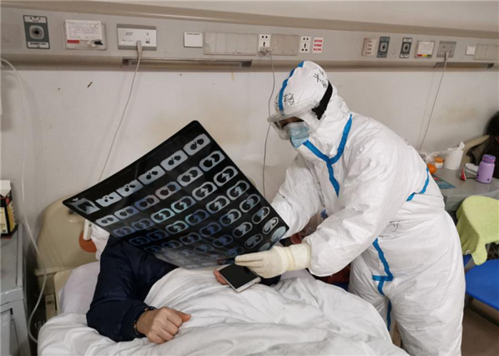 军队支援湖北医疗队队员敬梅在汉口医院为患者分析CT结果(2月1日摄)。新华社发
