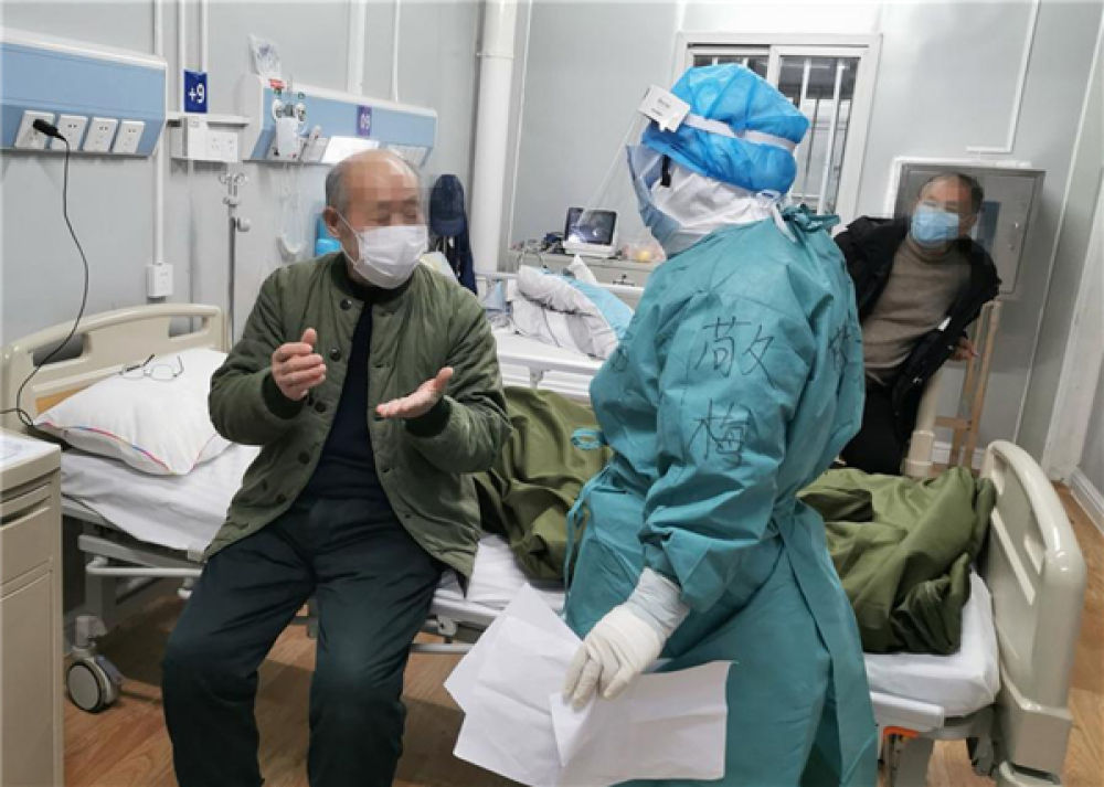 3月3日,火神山医院感染二科一病区医生敬梅在病区与患者交流。新华社发