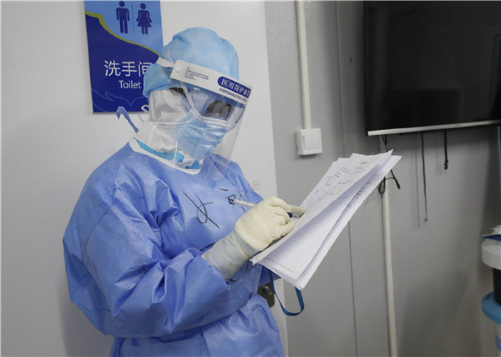3月8日,火神山医院感染二科一病区医生敬梅在病区工作。新华社发(吴浩宇 摄)