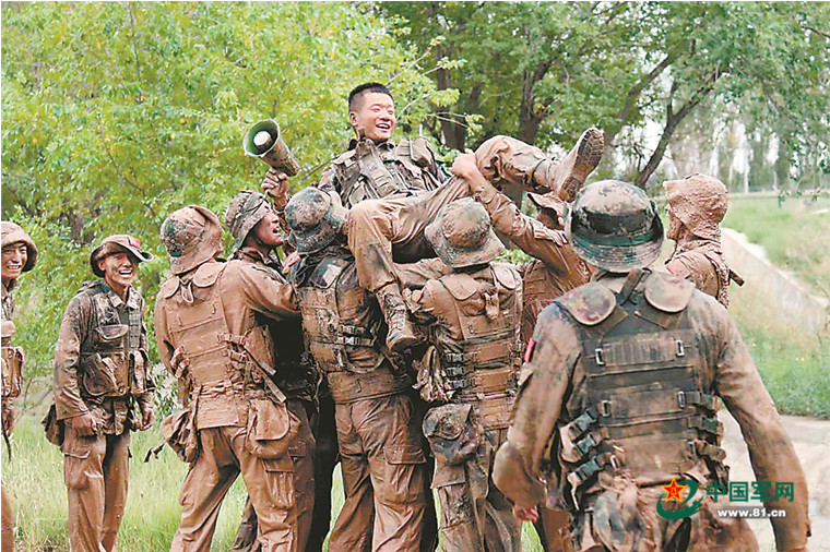 “魔鬼周”训练胜利结束,特战队员们将特战小队长马新庆抛向空中。张海虎摄