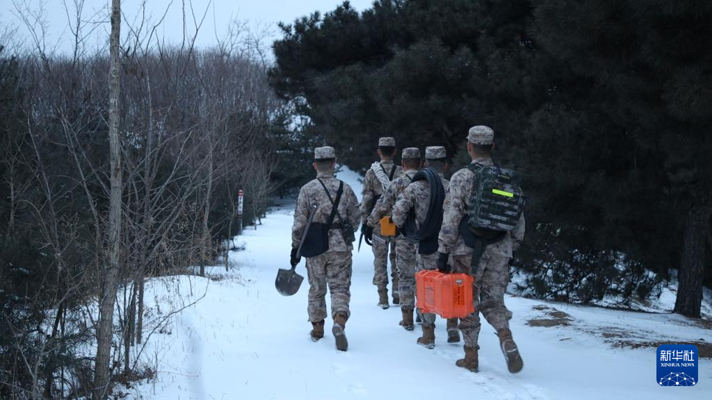 战略支援部队某部泰安站官兵在光缆线路巡检途中(视频截图,2月2日摄)。新华社发(史大帅 摄)