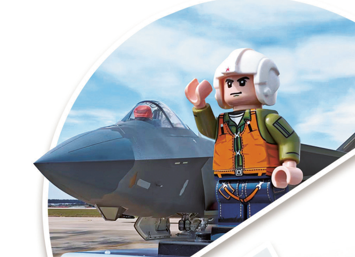 观众将飞行员造型的积木人与歼-20合影。陈学杰摄