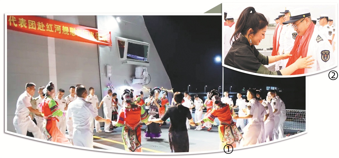 图①:云南省红河哈尼族彝族自治州慰问团成员与海军红河舰官兵联欢。李 眺摄 图②:四川省阿坝藏族羌族自治州慰问团成员向海军阿坝舰官兵献哈达。张 彬摄